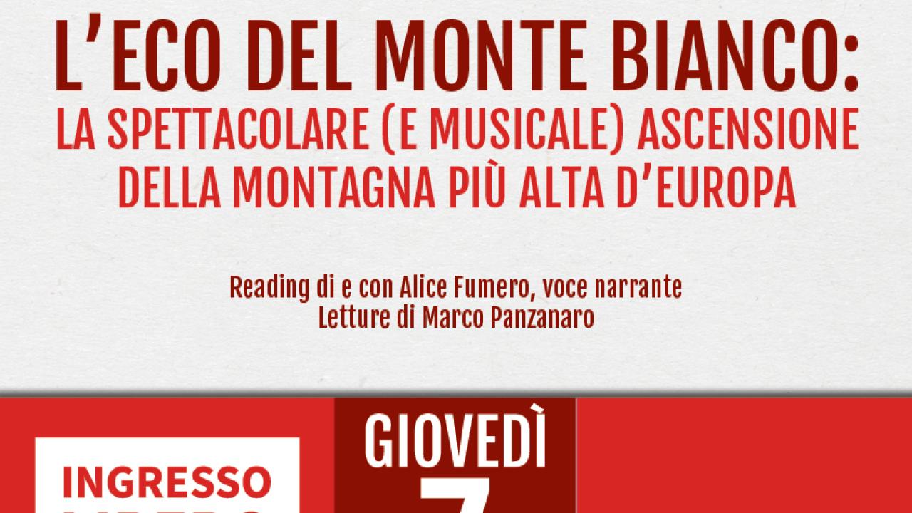 La prima ascesa del Monte Bianco del 1786 coincide simbolicamente con la nascita dell’alpinismo.   Le motivazioni scientifiche vennero presto sostituite dall’idea che scalare le vette fosse un’impresa sportiva, proibita ai più. Solo gli spettatori che all’Egyptian Hall di Londra assistevano al memorabile spettacolo The Ascent of Mont Blanc di Albert Smith (dal 1852 al 1856) attraverso le fantastiche narrazioni, i diorami, le musiche composte ad hoc potevano avere la sensazione di essere loro stessi a scalare la cima. Grazie alla straordinaria montblancmania suscitata da Smith, ripercorreremo la storia della scalata del Re delle Montagne e che cosa ciò abbia comportato dal punto di vista filosofico, letterario e musicale.    Voce narrante di Alice Fumero, letture di Marco Panzanaro.