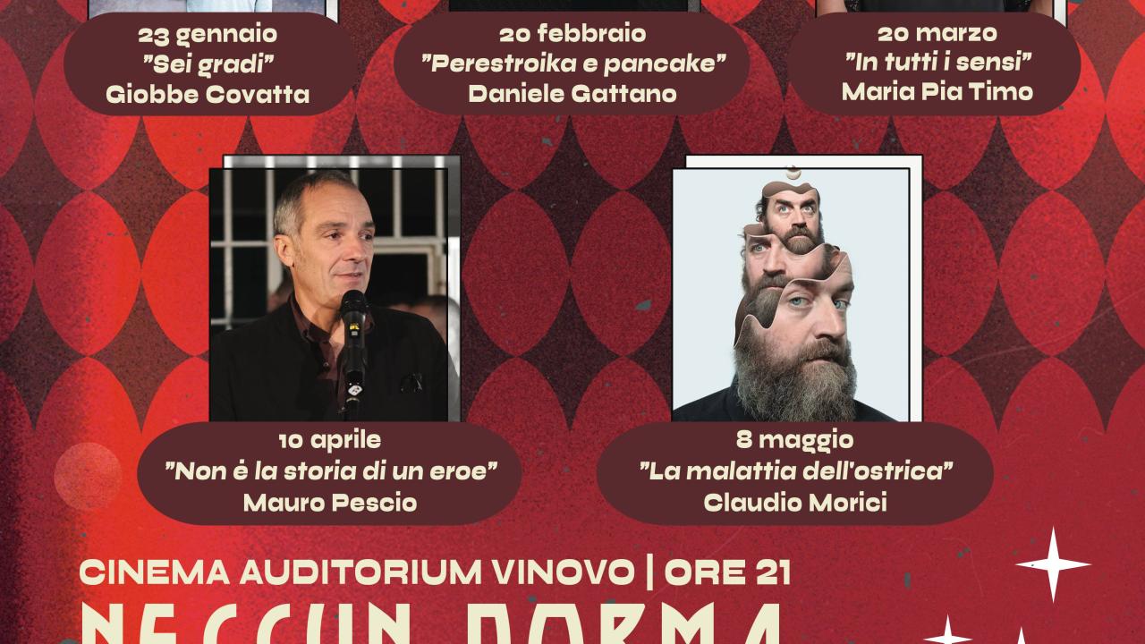 Torna in versione rinnovata la stagione teatrale del Comune di Vinovo: il cartellone 2026 offre infatti spettacoli e atmosfere eterogenei. • 23 gennaio - Giobbe Covatta in 6° (sei gradi) • 20 febbraio - Daniele Gattano in Perestroika e pancake • 20 marzo - Maria Pia Timo in In tutti i sensi • 10 aprile - Mauro Pescio in Non è la storia di un eroe • 8 maggio - Claudio Morici in La malattia dell'ostrica