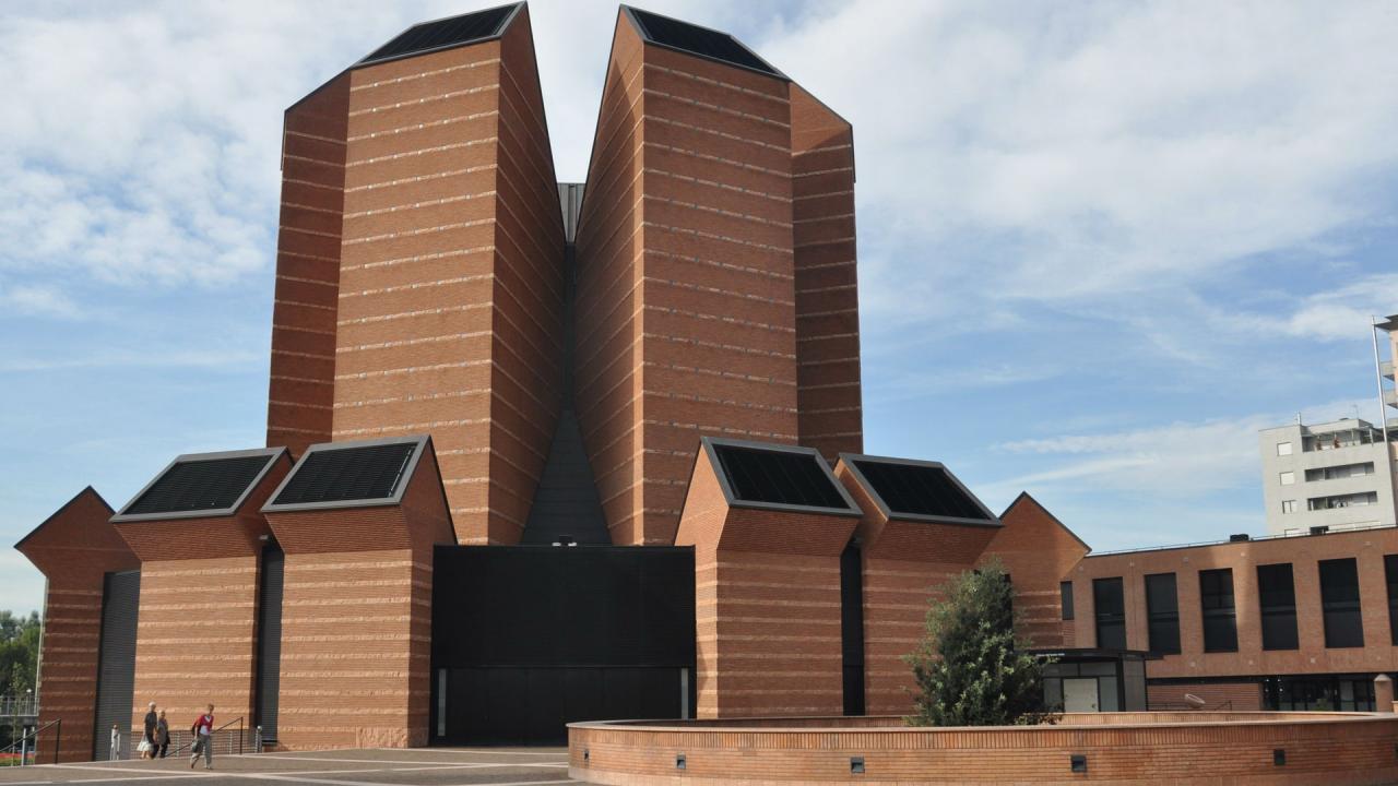 The Chiesa del Santo Volto is one of the most recent churches of Torino: it is the work of the Lugano-based architect Mario Botta and was inaugurated in December 2006 in a former industrial area which has been modernised. The church presents itself from the outside like a body surrounded by seven surrounding towers, all 35 metres high and without any apparent architectural hierarchy. After each tower, the chapels shrink in size one by one on the outside. Both the towers and the chapels, thanks to their cut-off tops, act like skylights and therefore emit the light from outside indirectly into the hall. The choice of a heptagonal form has allowed for the inner hall to be orientated in the direction towards the city along the axis of the entrance to the altar. This choice of locating the entrance inside the church courtyard rather than facing the city centre has given rise to numerous disputes with the authorities. The inner hall, which is very well illuminated, has a capacity of around 1,000. The Santo Volto della Sindone is situated behind the altar, which is illuminated by the stunning effect provided by the natural light flooding in from above. The effect occurs thanks to a particular use of ‘Verona red’ bricks which are mounted in a way to show a wedge for creating an area of shade combined with a flat side to reflect the light.
