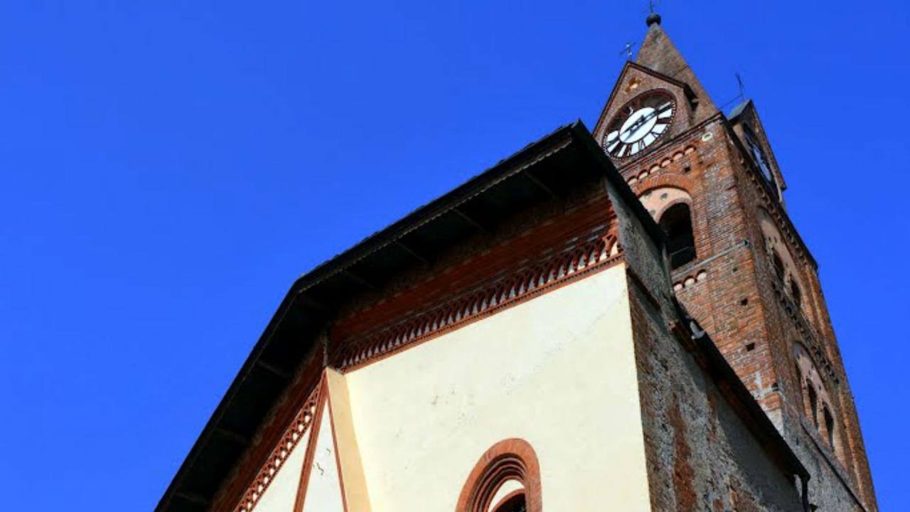 Built at the start of the 13th century, and concluded in the subsequent century with the construction of it facade. On one side of the building rises the striking cuspidate bell tower, one of the defining elements of the whole village profile, decorated with double and triple lancet windows and majolica walls above the belfry. On the inside, a frescoed covered narthex with cross vaults leads into the only nave which has remained following the transformation of the building in the Baroque era, which is also the era back to when the decoration and stucco date. Apart from the wooden pulpit, carved at the end of the 16th century, the painted tables by Defendente Ferrari, one of which being a polyptych of the nativity, signed and dated 1511, are particularly remarkable.