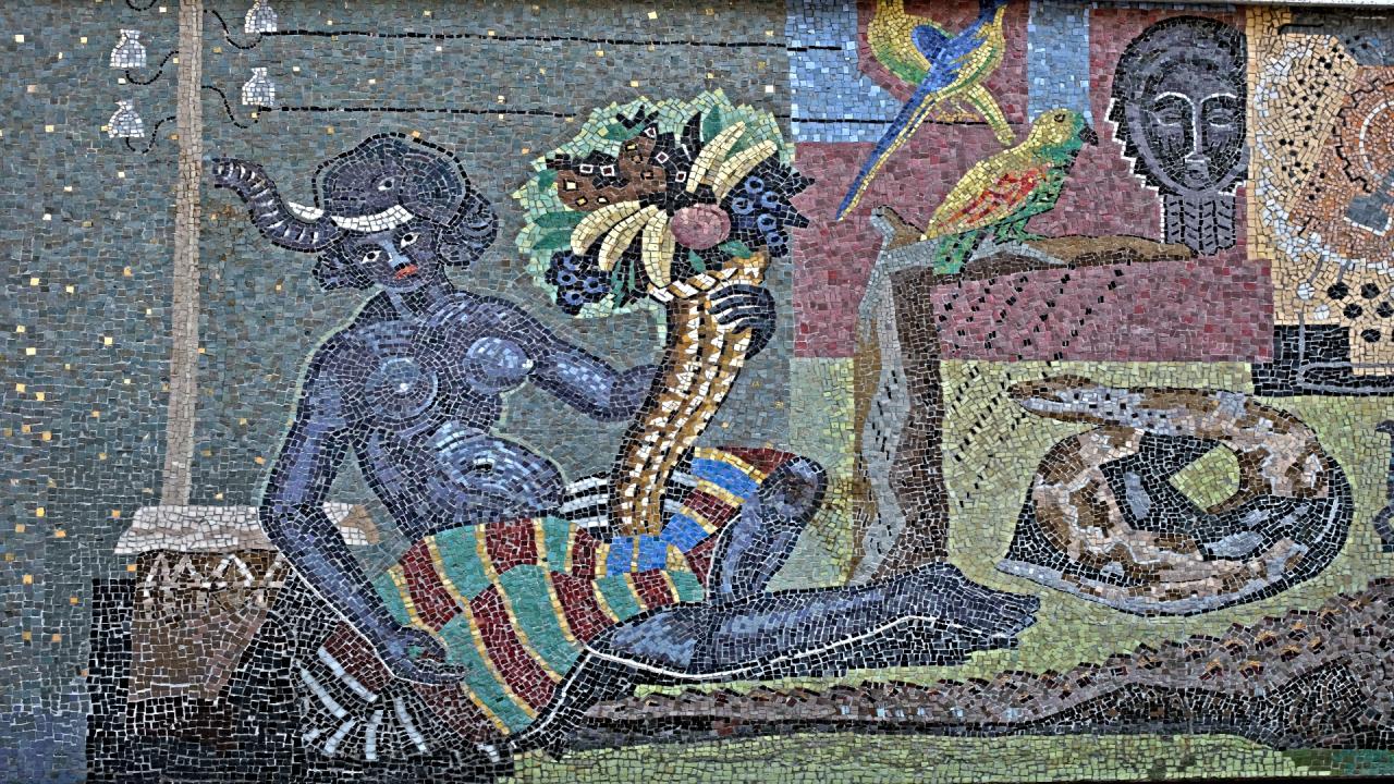 The work is divided into three parts: side mosaics represent the continents (left Oceania and Asia, right Africa and America) and central mosaics the history of the post and telegraph.