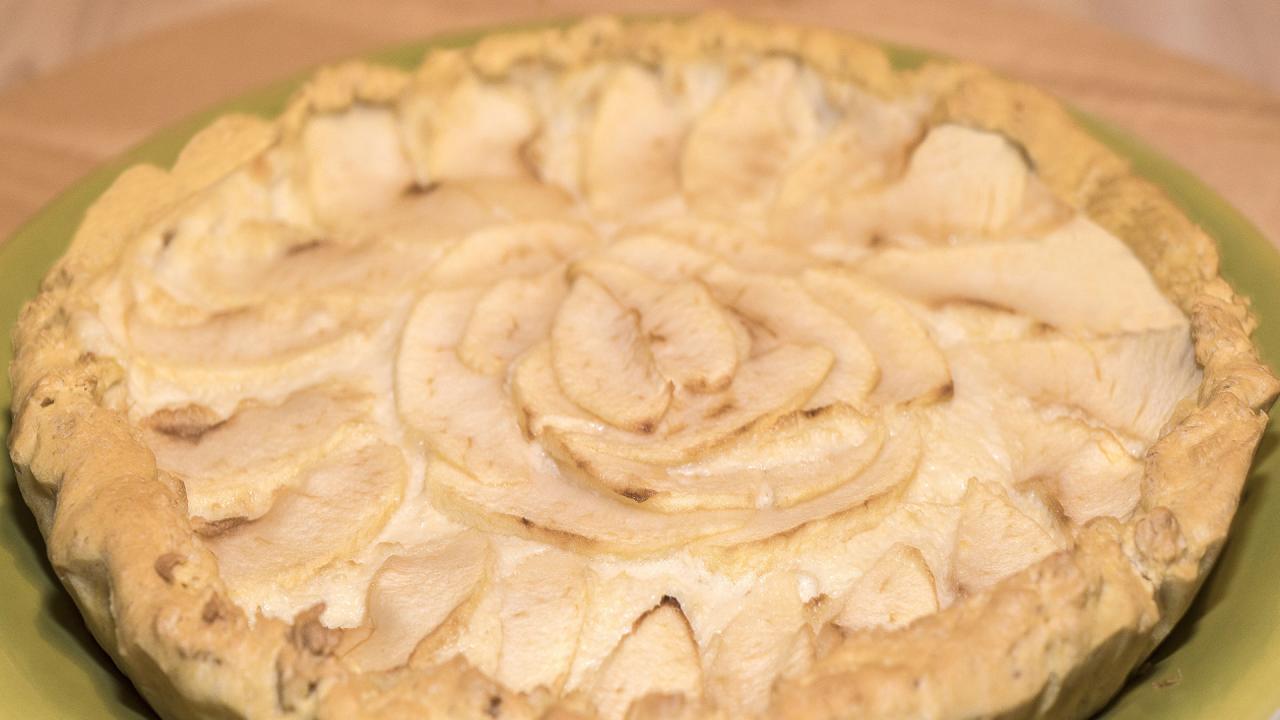 Peel and slice the apples, then cook them and sieve them. Add the crushed macaroons, cocoa, beaten eggs, sugar, grated lemon zest and a pinch of grated nutmeg to the apples. Cook in a buttered baking tin with a few flakes of butter on the surface.