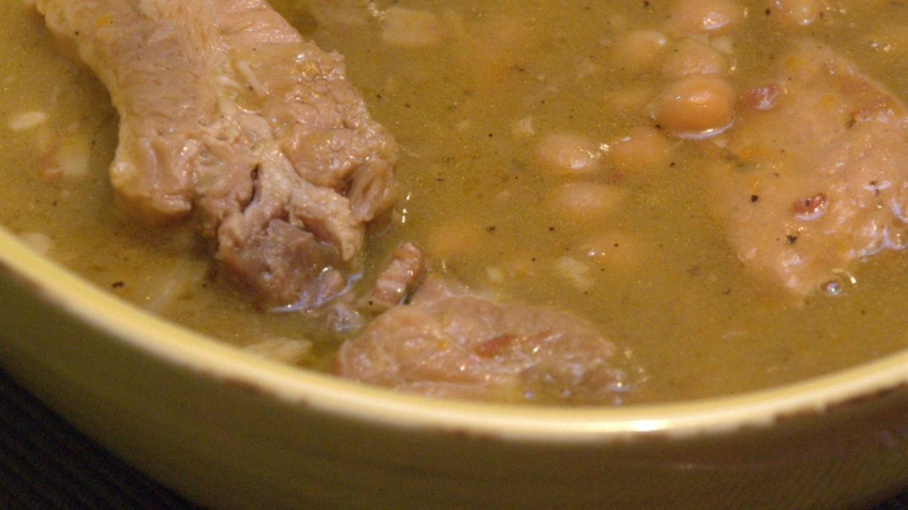 Bring one and a half litres of water to the boil. Add the previously cleaned pork ribs and trotter and cook for about 45 minutes. When the broth is ready, remove the meat and cook the previously cleaned and washed ajucche herbs for about five minutes. Gently fry the sausage and leave it to cool. Cut some slices of bread about one centimetre thick and fry them in a pan with plenty of butter.
