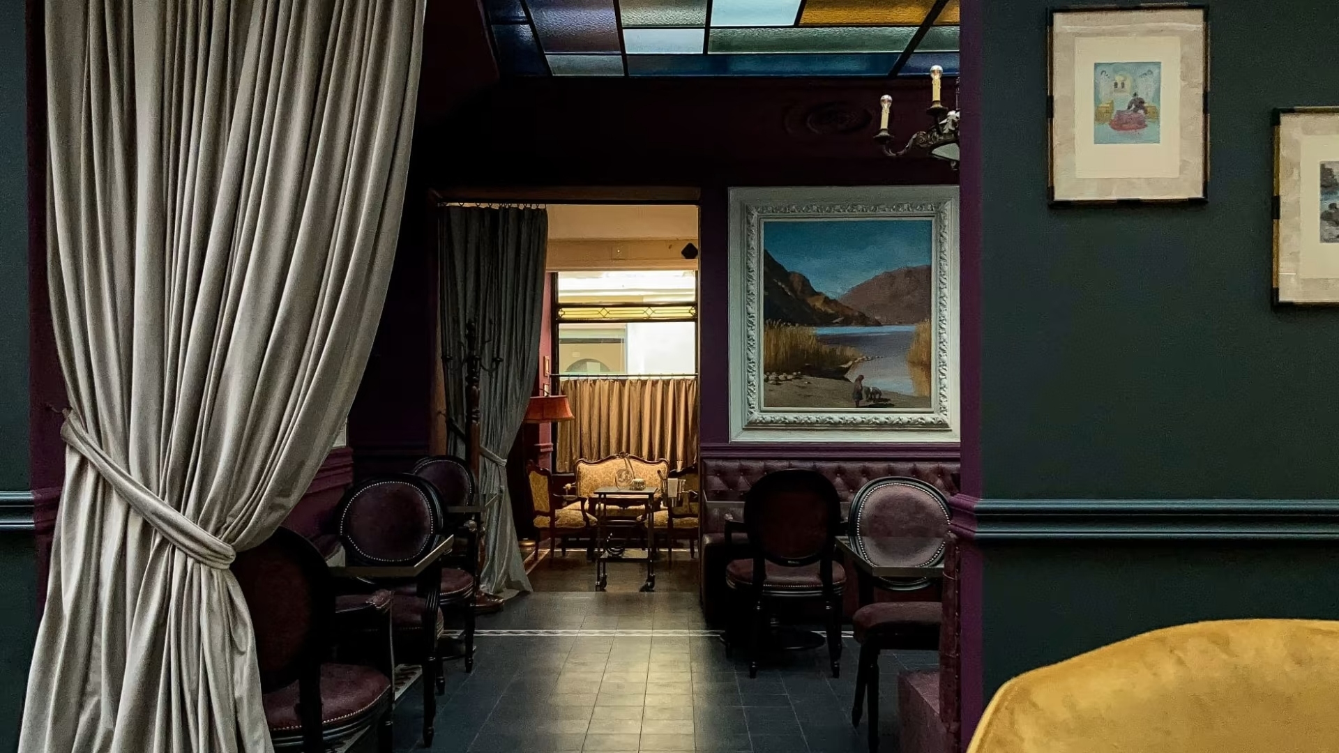 The indoor bistro instead expresses the cosmopolitan refinement of the Art Nouveau style of the early 1900s: at that time in this environment there was the renowned Caffè Pasticceria Milanese; even today it is possible to read, on the paneling of the original furniture, the inscription of the furniture company "Giovanni Galfetti e Figli" from Como. It is not a flamboyant but rather collected interior, to taste high-quality dishes with appropriate drinks, admiring the paintings on the walls under the light filtered by the multicolored skylights.