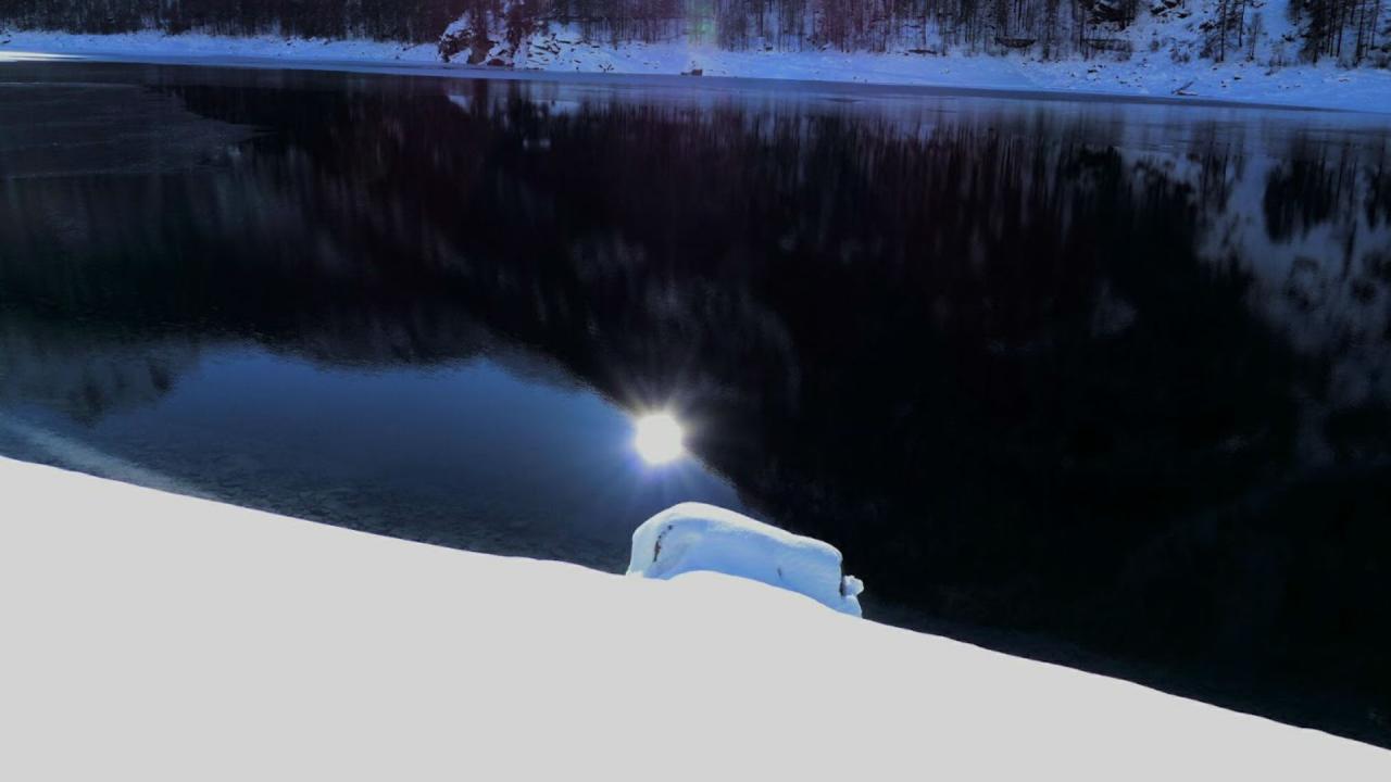 Continue slightly to the left, cross a bridge and you find yourself in wide open spaces. The route continues along a few huts and a large boulder and finally get you in sight of the lake.