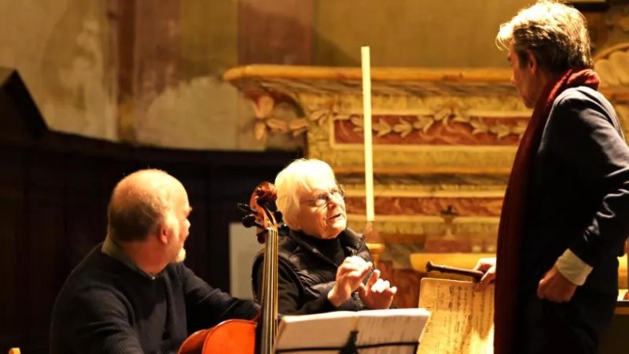 Tre musicisti in dialogo in una chiesa barocca