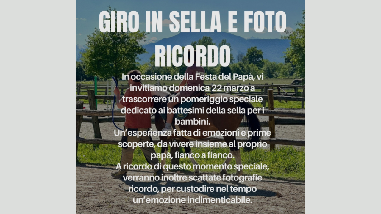 In occasione della Festa del papà, vi invitiamo a trascorrere un pomeriggio speciale dedicato al battesimo della sella: un’esperienza ricca di emozioni da vivere fianco a fianco del proprio papà e che permetterà ai bambini di muovere i primi passi nel mondo dei cavalli e dell’equitazione. Ma non solo! Per fissare questo momento speciale, sarà possibile richiedere fotografie ricordo professionali.