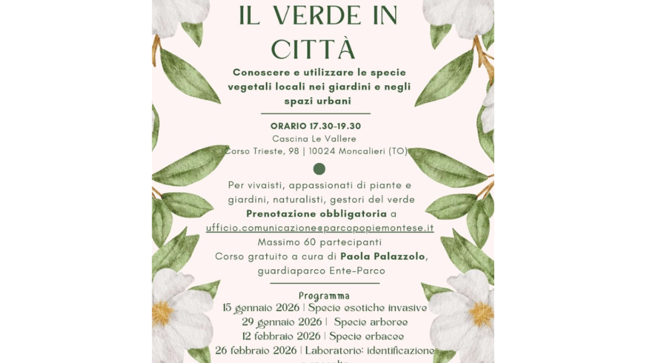 Corso gratuito per conoscere e utilizzare le specie vegetali locali nei giardini e negli spazi urbani: per vivaisti, appassionati di piante e giardini, naturalisti, gestori del verde. Programma • 15 gennaio: Specie esotiche invasive • 29 gennaio: Specie arboree • 12 febbraio: Specie erbacee • 26 febbraio: Laboratorio di identificazione e raccolta • 12 marzo: Laboratorio erbario • 26 marzo: Esperienze