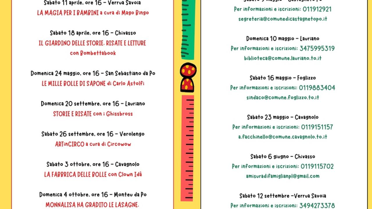 Passeggiate all'aria aperta che fanno bene alla salute dei bambini da 0 a 99 anni • sabato 9 maggio - Castagneto Po (t. 011.912921, segreteria@comunedicastagnetopo.it) • domenica 10 maggio - Lauriano (t. 347.5995319, biblioteca@comune.lauriano.to.it) • sabato 16 maggio - Foglizzo (t. 011.9883404, sindaco@comune.foglizzo.to.it) • sabato 23 maggio - Cavagnolo (t. 0119151157, a.facchinello@comune.cavagnolo.to.it) • sabato 6 giugno - Chivasso (t. 011.9115702, amisuradifamiglianpl@gmail.com) • sabato 12 settembre - Verrua Savoia (t. 3494273378, cinziasantangelo1967@gmail.com) • domenica 13 settembre - Monteu da Po (t. 011.9187813, anagrafe@comune.monteudapo.to.it) • sabato 19 settembre - Montanaro (t. 320.5617450, e.marchisio@comunemontanaro.it) • sabato 17 ottobre - San Sebastiano da Po (t. 339.5806352, candida_it@yahoo.com)