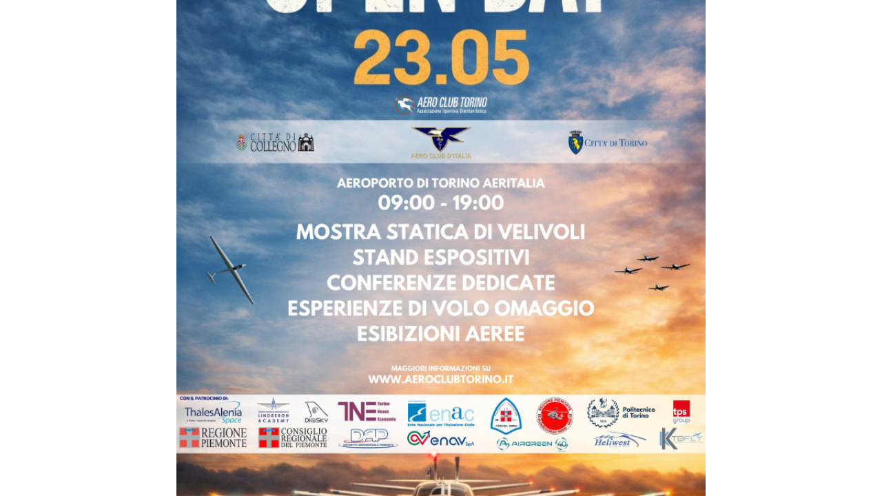 L'Aero Club Torino organizza il proprio Open Day 2026, una giornata aperta gratuitamente alla cittadinanza dedicata alla cultura aeronautica, alla formazione e alle eccellenze del comparto aerospaziale piemontese. L'evento propone un programma ricco e variegato: • voli dimostrativi gratuiti rivolti a studenti e cittadini (non prenotabili, assegnati in loco) • simulatore di volo e mostra statica di aeromobili • stand espositivi delle principali realtà del comparto aeronautico e spaziale • conferenze in hangar su orientamento e formazione aeronautica • possibili esibizioni aeree nel pomeriggio Tra i partecipanti confermati figurano Thales Alenia Space, Distretto Aerospaziale Piemonte, DigiSky, Airgreen, Heliwest, TPS, Politecnico di Torino, Istituto Tecnico Aeronautico Lindbergh, Aeronautica Militare, Marina Militare, reparti volo di Vigili del Fuoco, Carabinieri e Polizia di Stato, Azienda Zero - Servizio regionale Elisoccorso, Soccorso Alpino e KKtoFly, insieme a numerose istituzioni accademiche e locali. Intorno alle ore 12.00 è previsto un importante momento istituzionale: la firma della convenzione tra Politecnico di Torino e Aero Club Torino, un accordo destinato a rafforzare il legame tra formazione universitaria e pratica aeronautica sul territorio.