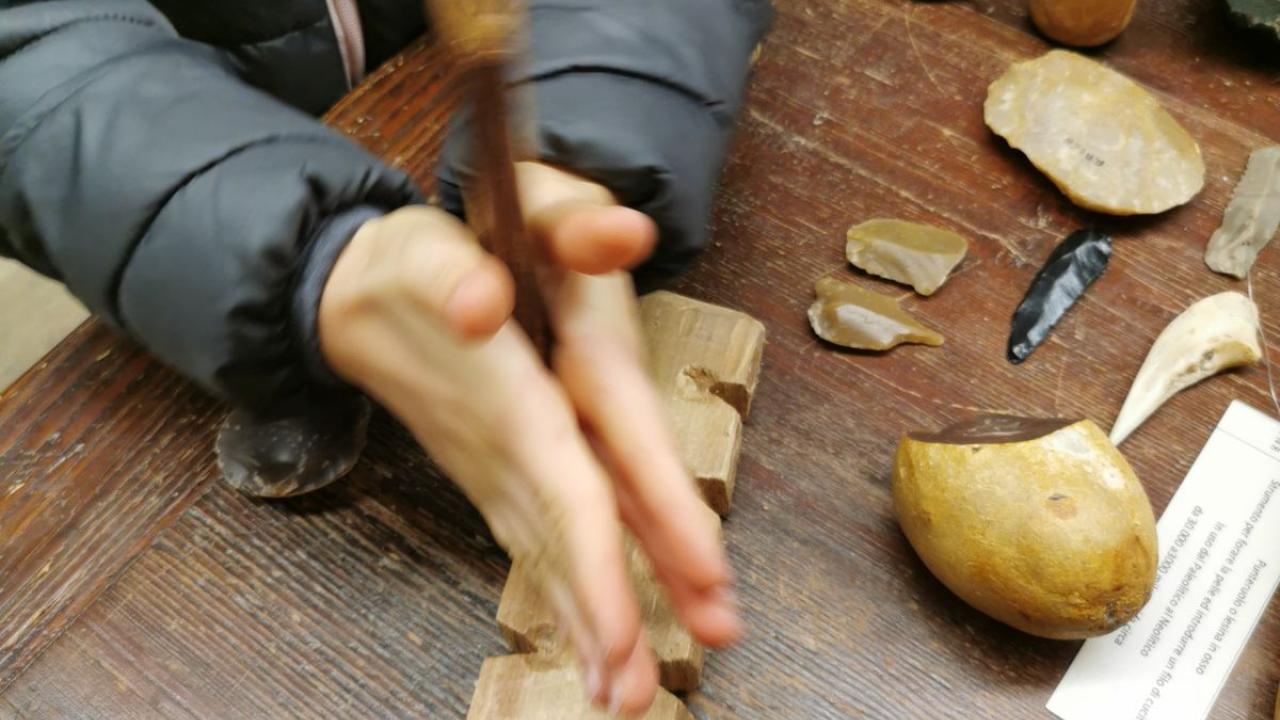 La visita guidata di un’intera giornata prevede: • visita al Museo, presentato in modo adeguato all’età del gruppo. L’esposizione offre un percorso di tipo tematico che avvicina gli allievi ai bisogni primari e alle tecnologie antiche: la casa, il fuoco, la lavorazione della pietra e dell’argilla, le fibre e la tessitura, l’allevamento e la coltivazione, la caccia, il cibo, i primi metalli. Si segnalano la ricostruzione di un interno di capanna neolitica e il diorama di un’officina dell’Età del Bronzo. I pannelli sulla vita quotidiana dell’Uomo Primitivo sono completati da altri, che riguardano i Periodi, ma anche la Preistoria in Valle di Susa: siti archeologici, evoluzione geologica e culturale. Della visita guidata fanno parte le esperienze con la Collezione Tattile: la possibilità di toccare ed esplorare direttamente i manufatti riguarda l’esercizio delle capacità percettive e sensoriali, sollecita interesse e attenzione, porta alla conoscenza di materie prime, tecniche e strumenti di lavorazione, natura e funzioni dell’oggetto • percorso archeologico nel bosco: la camminata non è eccessivamente impegnativa ma richiede scarpe e abbigliamento adeguati a una camminata nel bosco con leggere salite e discese. Attraverso il suggestivo scenario dei resti dell’antica cava di gneiss si arriva alle tappe principali: il Riparo sotto Roccia “Rumiano” (luogo dei ritrovamenti archeologici), la “Baità” (sito in cui verosimilmente sorgeva il villaggio preistorico, nel quale è stata ricostruita la grande capanna neolitica) e la Zona Palustre (ricca di spunti per approfondire i contenuti della visita anche dal punto di vista naturalistico) • laboratori didattici: introdotti da una presentazione/conversazione teorica, prevedono materiali, strumenti e procedimenti in uso nella Preistoria. È possibile scegliere il laboratorio dal sito (pagina scuole suddivisa per grado di scuola). ATTIVITA' SU PRENOTAZIONE